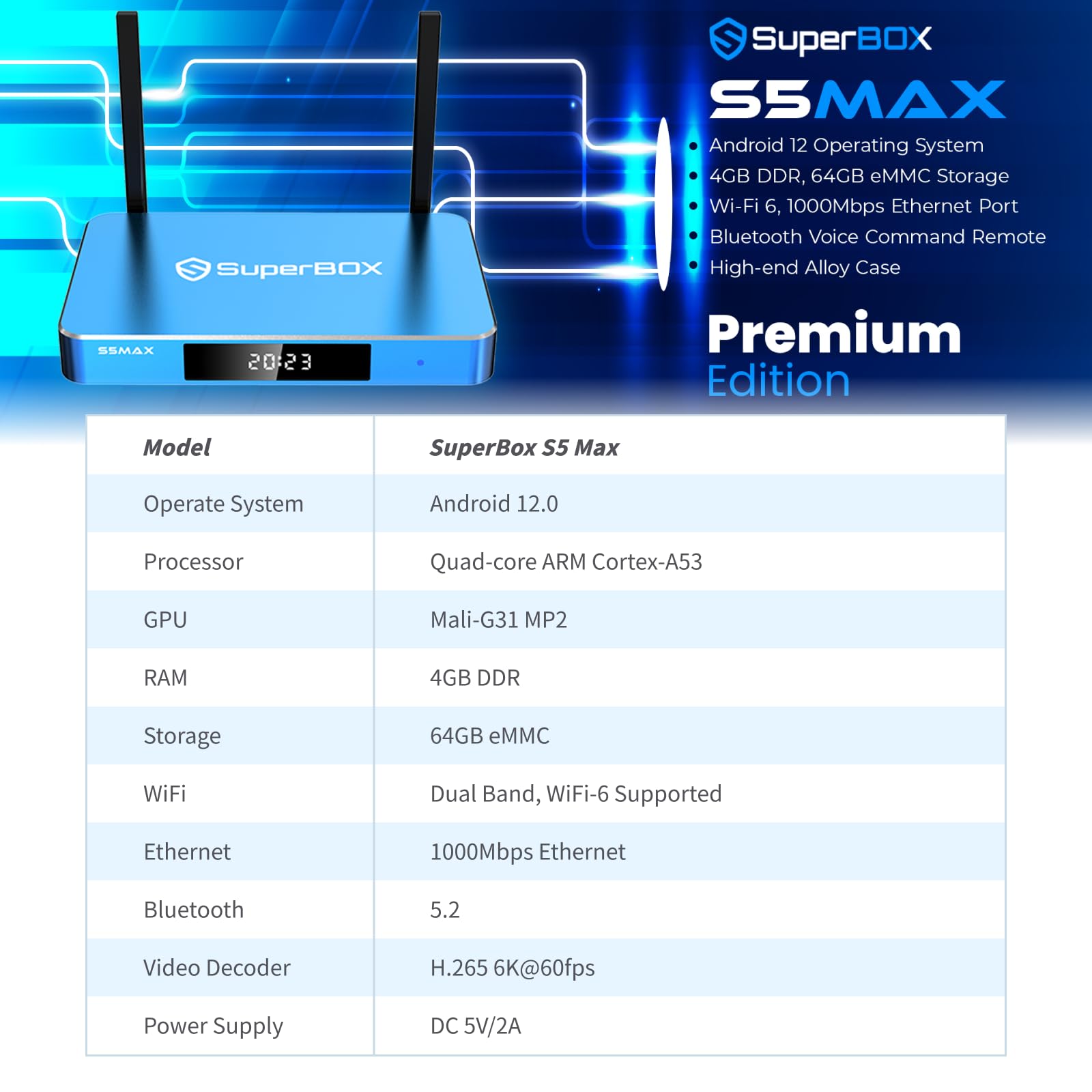 - In comparison to the S4 Pro, the SuperBox S5 Max features Android 12, 4GB RAM, 64GB storage, a 1000Mbps ethernet connector, and WiFi 6. As well as an improved voice control system.